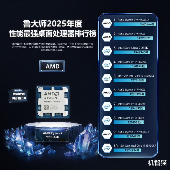 AMD Ryzen 9 9950X3D 荣获“2025年度性能最强桌面处理器”。依托第二代 3D V-Cache 技术带来的 144MB 超大缓存,其在高帧电竞与专业生产力双赛道同时拉满上限:游戏端轻松突破千帧,创作端则以更稳定的吞吐能力建立优势,代表了桌面平台性能天花板的最新高度。