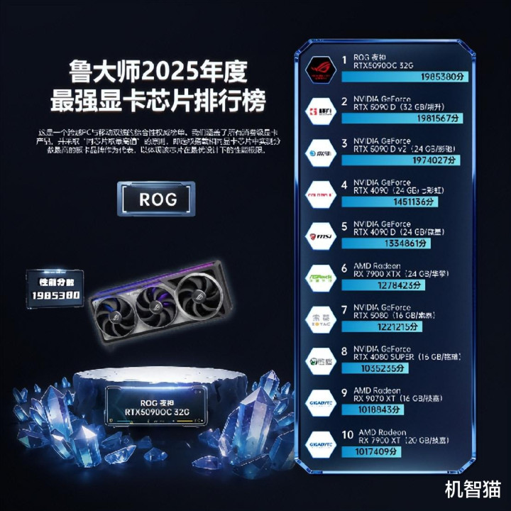 ROG 夜神 RTX5090OC 32G 获评“2025年度最强显卡芯片”。这是一张把旗舰性能与工程设计做到极致的显卡:独家四风扇系统与真空腔均热板的组合,确保了极限负载下依旧冷静稳定,体现了 ROG 在高端硬件领域“把性能释放做成体系化能力”的长期积累。