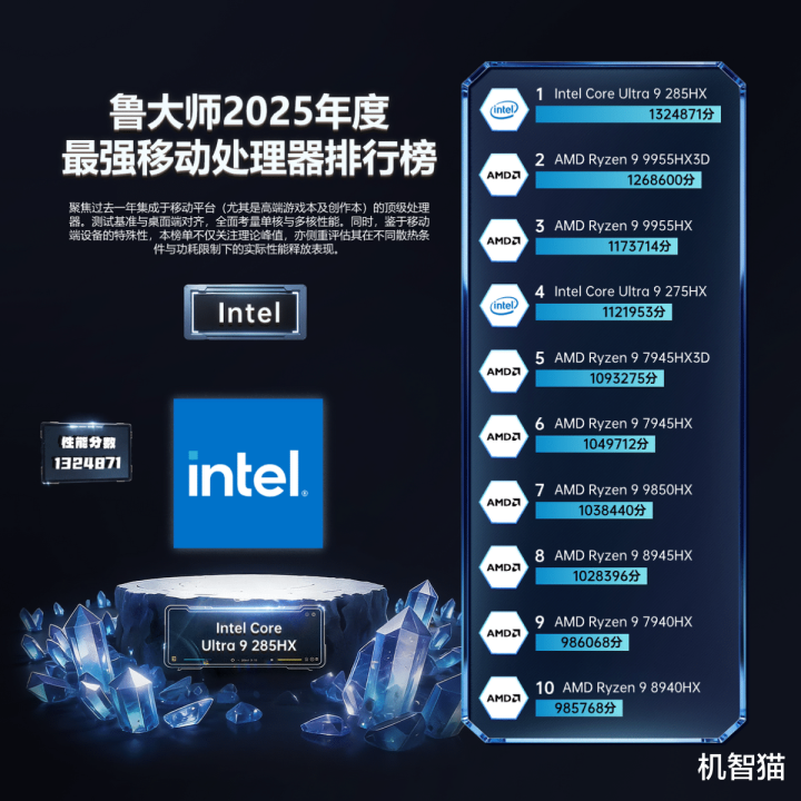 Intel Core Ultra 9 285HX 摘得“2025年度性能最强移动处理器”桂冠。以 原生24核架构与最高5.5GHz睿频 为核心,它在 55W 基础功耗下实现性能与能效的同步突破,并深度耦合 AI 加速能力,让移动端从“能跑”到“全程高能”完成跃迁,是高性能本平台的年度标杆。