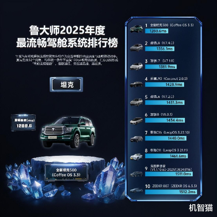 全新坦克500(Coffee OS 3.3) 获评“2025年度最流畅驾舱系统”。它以 1288.6ms 的流畅指数刷新纪录,在导航切换、语音唤醒等高频场景全面领跑,证明硬派越野不仅能征服复杂路况,也能把智能体验做到行业顶尖。