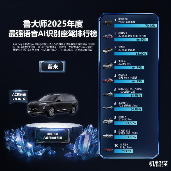 蔚来 ES8 六座行政豪华版 荣膺“2025年度最强语音AI识别座驾”。凭借 Cedar S 雪松系统与 NOMI 智能伙伴,它以 70.42% 语音识别率 夺冠,同时成为 71 款参评车中唯一支持语音控制双闪的产品,让“语音交互”从能用走向可靠、从好玩走向安全。