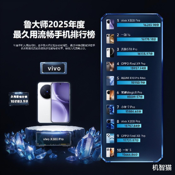 vivo X300 Pro 荣获“2025年度最久用流畅手机”。依托天玑9500与自研蓝河流畅引擎,它在超核计算与光子存储能力加持下,以 16283.98 的高分验证长期使用依旧响应迅捷,体现了“耐久流畅”从口号到能力的落地。