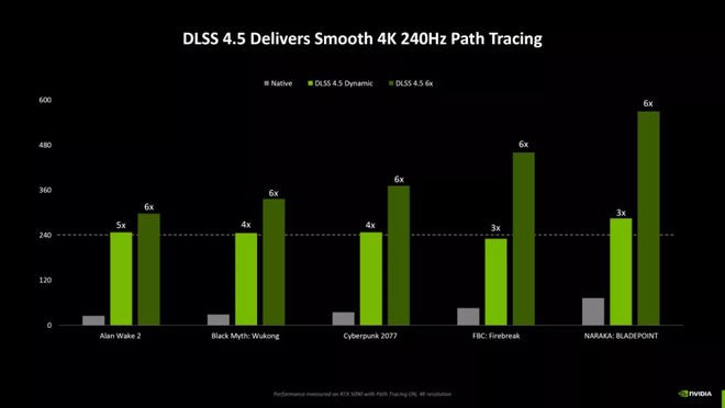 DLSS4.5引入了6倍多帧生成模式,其中一帧传统渲染后,最多可连续五帧由AI生成。玩家能在RTX50系列GPU上实现240Hz4K的画质。