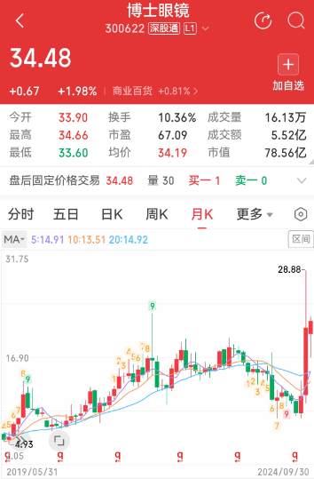 余韩操纵期间,博士眼镜股价月线图。