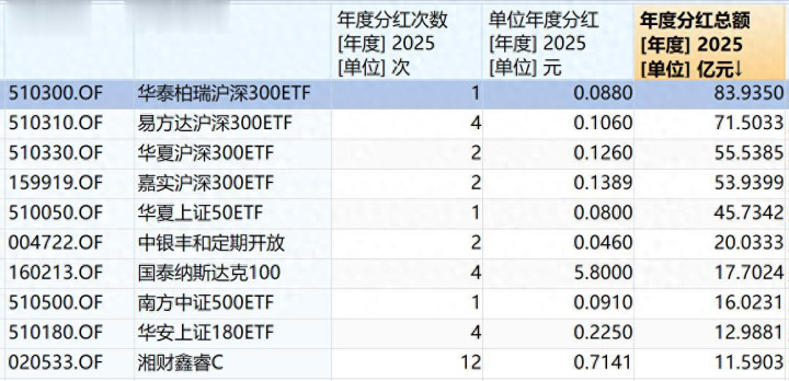 2025年,全市场公募基金分红总额2400多亿元,年度分红总额前十的基金如下。