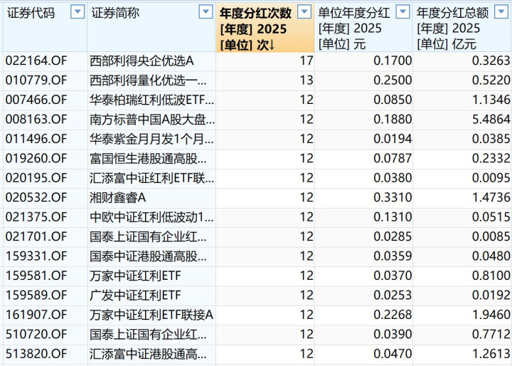 从分红频率来看,2025年内分红次数在12次以上的基金共16只。其中西部利得央企优选以一年之内17次分红位居榜首,这只基金5月份分红三次,6月份分红两次,单单7月份,就分红五次,比发工资勤快多了。