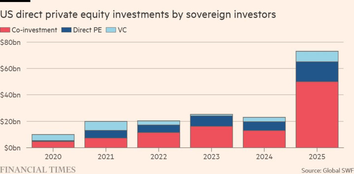 {jz:field.toptypename/}咨询公司Global SWF的数据显示,2025年全球主权财富基金的私人信贷投资达5500亿美元。去年,它们在美国的直接私募股权投资规模增长了两倍多,达到730亿美元,开云其中三分之二为联合投资。