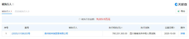 相比这两家公司,天府银行的第八大贷款客户贵州铭丰瑞贸易有限公司被执行金额要大得多,达到了7.8亿元,而且被限制消费,他们与四川明宇集团和南充市恒盛商贸有限公司属于同一案,案号都是(2025)川13执323号。该公司在天府银行的贷款余额为7.56亿元。
