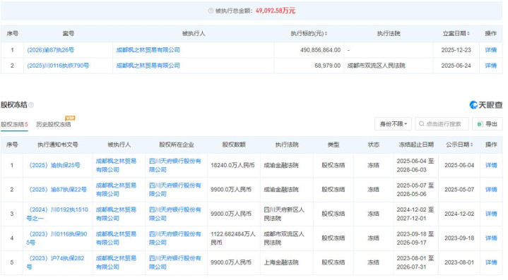 另外,从2023年8月1日到2025年6月4日,成都枫之林贸易先后5次被冻结所持天府银行股权,分别是9900万元、1122.68万元、9900万元、9900万元和1.82亿元,共计约4.9亿元。