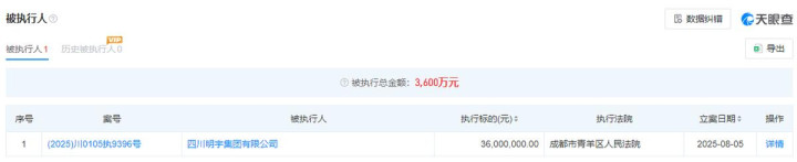 天府银行的第三大股东是四川明宇集团有限公司,持股比例从2023年的9.98%降至5.32%。天眼查显示,2025年8月5日,四川明宇集团新增一条被执行信息,被执行金额为3600万元。