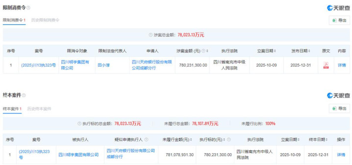 另据2025年12月31日发布的消息,四川明宇集团因未按执行通知书指定的期间履行生效法律文书确定的给付义务,被限制消费。值得一提的是,四川明宇集团的母公司南充市恒盛商贸有限公司也牵涉其中,开云app官方下载同样被限制消费,该案涉案总金额高达7.8亿元。