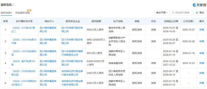 明宇集团所持的9994万元天府银行股权,也在2025年10月27日被冻结。这并非明宇集团首次被冻结所持天府银行股权,早在2024年12月23日,6.43亿元股权被冻结;2025年3月28日,3883.33万元股权被冻结。也就是说,明宇集团被冻结的天府银行股权达到了7.82亿元。