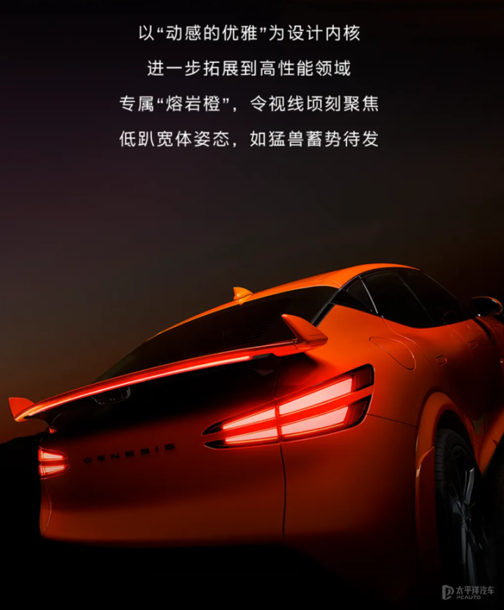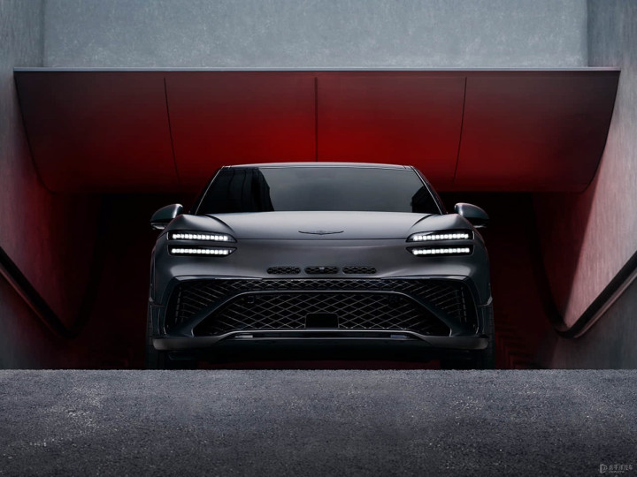 前脸保留了捷尼赛思标志性的双层分体式大灯组,但增加了更具攻击性的运动包围。前包围中间采用三孔散热开口设计,可优化空气流动与冷却效率。