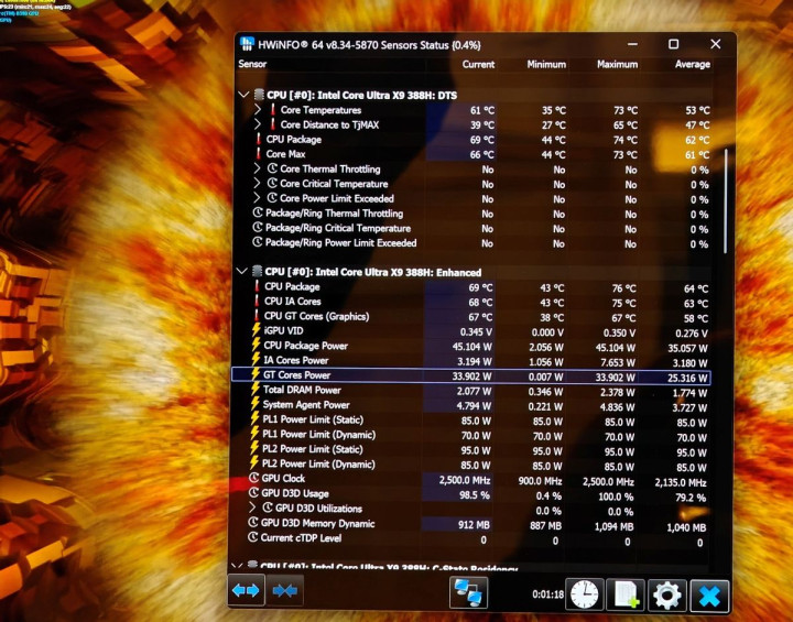 ▲而更夸张的是:老牛我测试了Arc B390的最高显卡功耗,只有33W!而竞争对手的Radeon 780M/880M集显动辄就要50W/53W。换句话说:这类处理器放在14英寸的小钢炮机型里,也能轻松压住功耗。