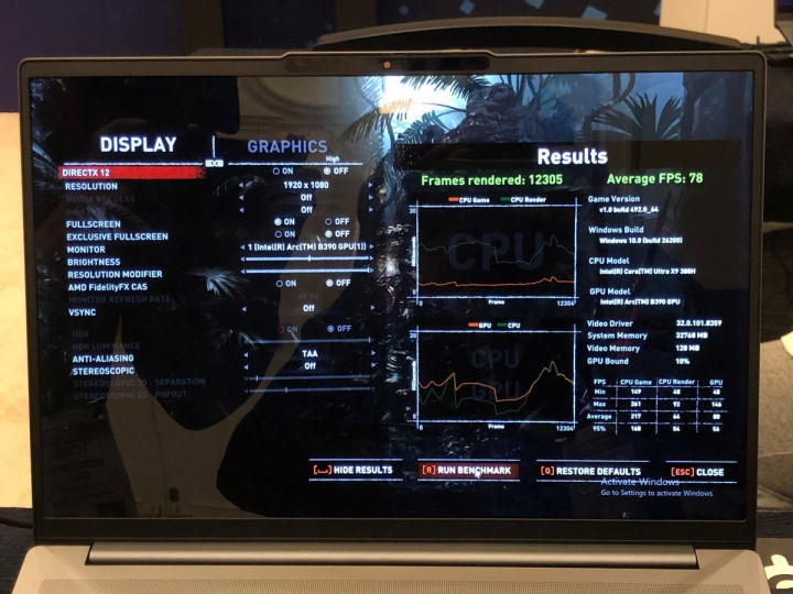 按照OEM厂商透露的数据,Ultra X9 388H的Arc B390集显,3Dmark Time Spy可跑到7200分(是的你没有看错)。然后老牛我在CES现场用新款的小新Pro 16GT进行了3A游戏实测,下面是跑分截图▼
