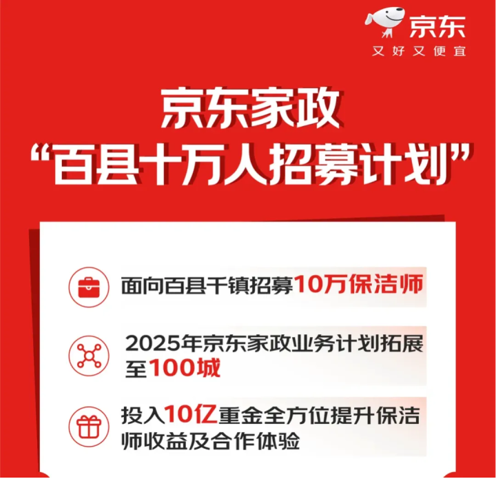 此外,去年年初,京东家政发布十万人招募计划,面向百县干镇招募10万名保洁师。同年年末,其布局再进一步,京东家政西南培训基地在重庆万州正式开班运营,为本地生活服务持续强化人才供给。