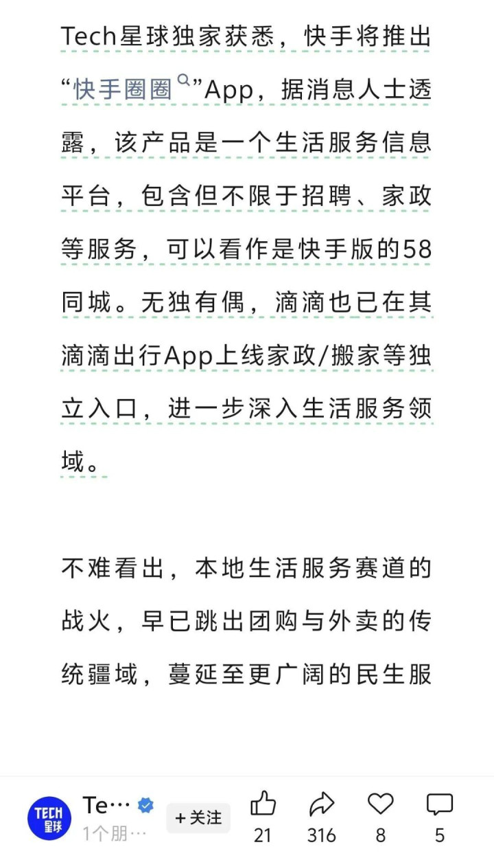 据Tech星球独家透露,快手即将推出“快手圈圈”App,该App包含但不限于招聘、家政等民生服务领域。