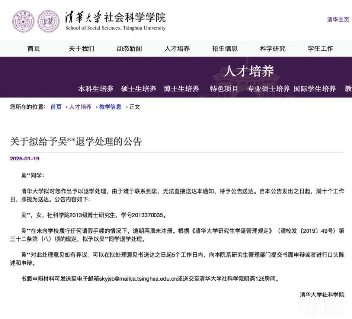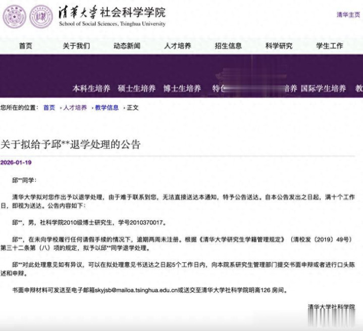 两则清华大学社会科学学院的退学公告,让“名校光环”与“学术规则”的碰撞再次引发关注。2010级博士生邱某和2013级博士生吴某因逾期两周末注册且无法联系,被学校拟予退学处理。这则迟来的公告,背后不仅是个人学业的中断,更折射出顶尖学府对学术规范的坚守,以及博士研究生培养中“宽进严出”的现实困境。