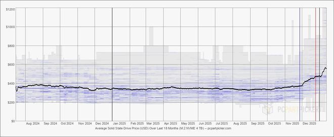 PCPartPicker的价格追踪曲线清晰地展示了这一趋势:过去两个月内,4TBSSD的价格出现了剧烈攀升。图表中价格分布范围的扩大(灰色区域),暗示着旧价格体系下的库存正在逐渐消失。