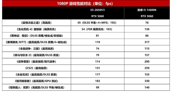 首先看看E5-2650V3平台自己的游戏表现。在《霍格沃兹之遗》、《生化危机4》重制版、《全面战争:三国》、《战争雷霆》、《CS2》、《银河破裂者》这些没开DLSS或者不支持DLSS的游戏中,E5-2650V3在要求较高的情况下确实就有点吃不消了。例如在《霍格沃兹之遗》、《生化危机4》重制版中就无法达到60fps的流畅及格线。但是还好我们选择的是RTX 5060,开启DLSS和帧生成之后,帧率暴涨,瞬间达到了流畅游玩的水平,等6×多帧生成正式上线后,还可以进一步提升,这就是为什么预算再紧张也得优先入手一块RTX 50显卡的原因。