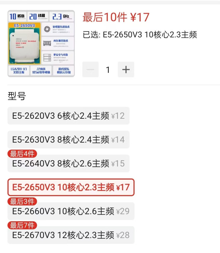 比较有DIY经验的老鸟对于Intel至强E5系列处理器可以说是相当熟悉了。这块E5-2650V3也不过是其中一块很平常的型号,拥有10核20线程的规格,默认频率2.3GHz,最高睿频3.0GHz,这个低得令人无法直视的频率在主流处理器面前基本上就是个笑话。不过,人家只要17元,还没一杯好点的咖啡贵,要什么自行车?至于配套主板,各种全新魔改X99多得很,也有店家质保。此外也有支持DDR4和DDR3的版本,所以追求极致便宜的电垃爱好者甚至还可以搭配更便宜的DDR3内存……都吃稀饭咸菜了,也就别嫌弃垃圾了。