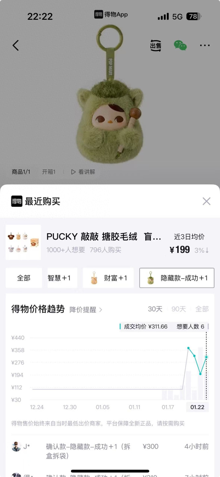 在得物平台上,隐藏款“成功”市场成交价由99元上涨至396元,溢价3倍。常规款中,销量最高的是“智慧”,该产品市场成交价由99元上涨至209元,溢价1倍。此外,贝壳财经记者在闲鱼等二手交易平台上看到,该系列的普通款溢价不高,卖家售价普遍在90多到100出头,但隐藏款标价多在250元及以上。